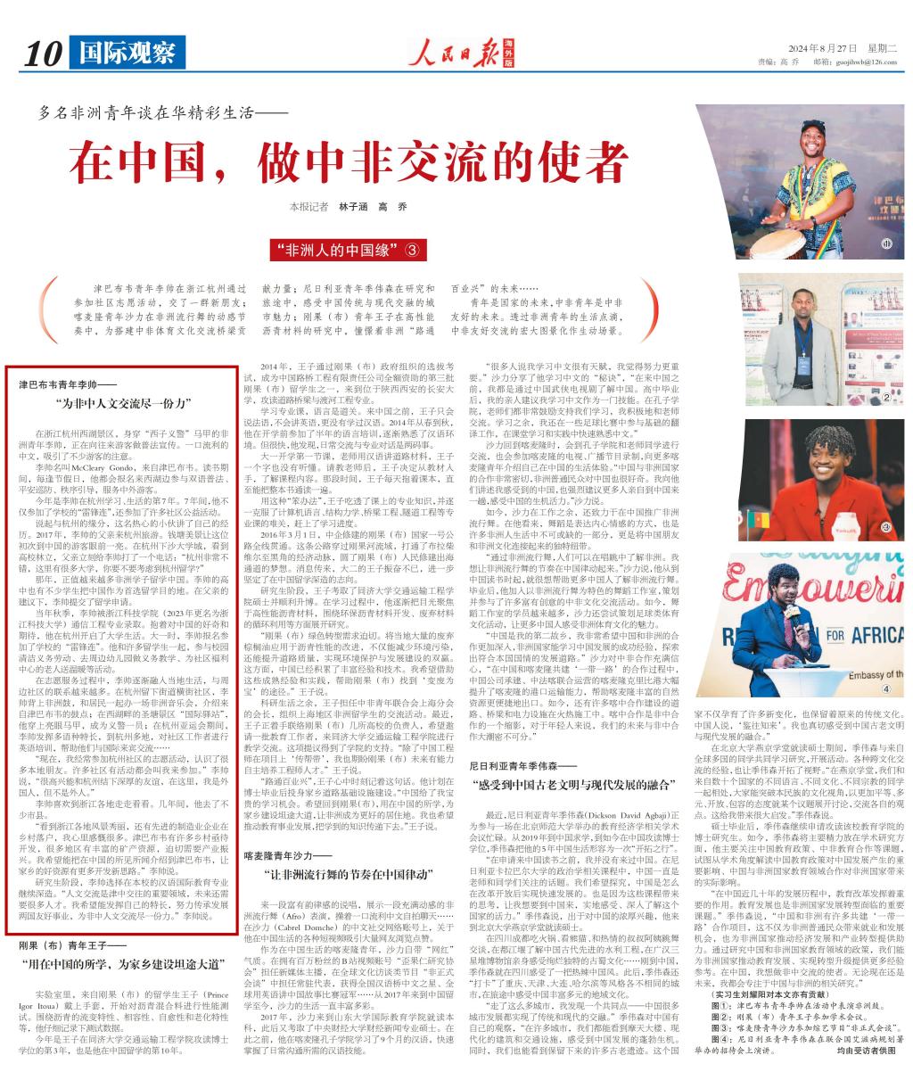2024年中非合作论坛峰会召开前夕,《人民日报》海外版推出“非洲人的中国缘”系列报道。8月27日该系列推出整版报道《在中国,做中非交流使者》,讲述了我校津巴布韦籍留学生李帅等3位非洲青年的故事。9月4日浙江卫视“新闻深一度”也关注了李帅参加志愿服务,推进中非青年交流的故事。以下为报道内容: