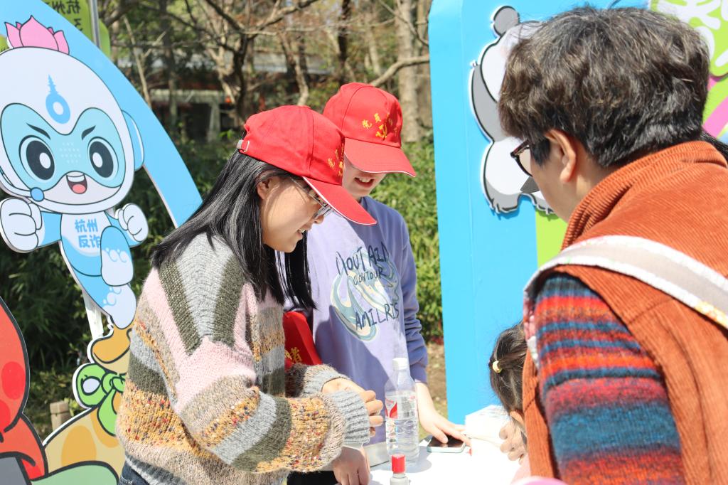 本次活动是杭州动物园为大熊猫春生5周岁生日举办的杭州“萌动春日 情暖春生”生日会,上万名来自全国各地的游客齐聚。在大熊猫趣味知识科普区,志愿者们化身生态使者为大小朋友们讲解熊猫保护知识和春生的“小秘密”;在活动打卡区,志愿者们化身为主持人,引导小朋友们体验套圈游戏、用彩笔为春生画像写祝福、参与“学科普 上强国”知识竞赛。在文化体验区他们创意十足,志愿者们为小朋友们制作熊猫、醒狮、中国结等形态各异的糖画,他们还协助杭州民警向游客们开展反诈宣传。